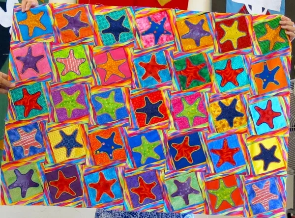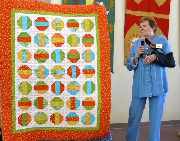 Show & Tell continues with Guild Members "first quilt" or quilt project. Shown is Anne-Marie with her first quilt. Through the four blocks, she learned different techniques.